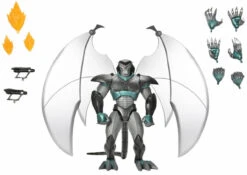 This impressively large figure stands over 8” tall and includes gauntlet blasters, attachable thruster blasts and interchangeable hands. Also features bendable tail and open and closed wings.