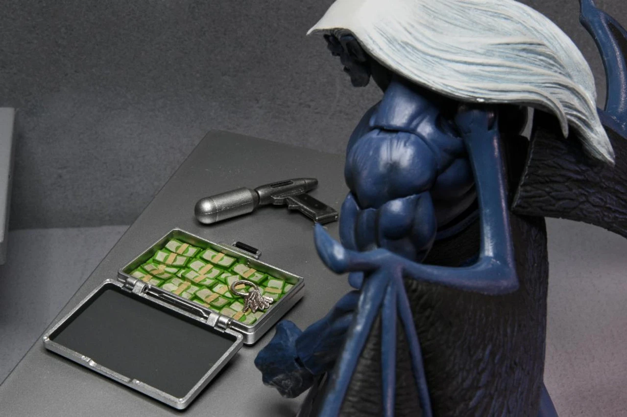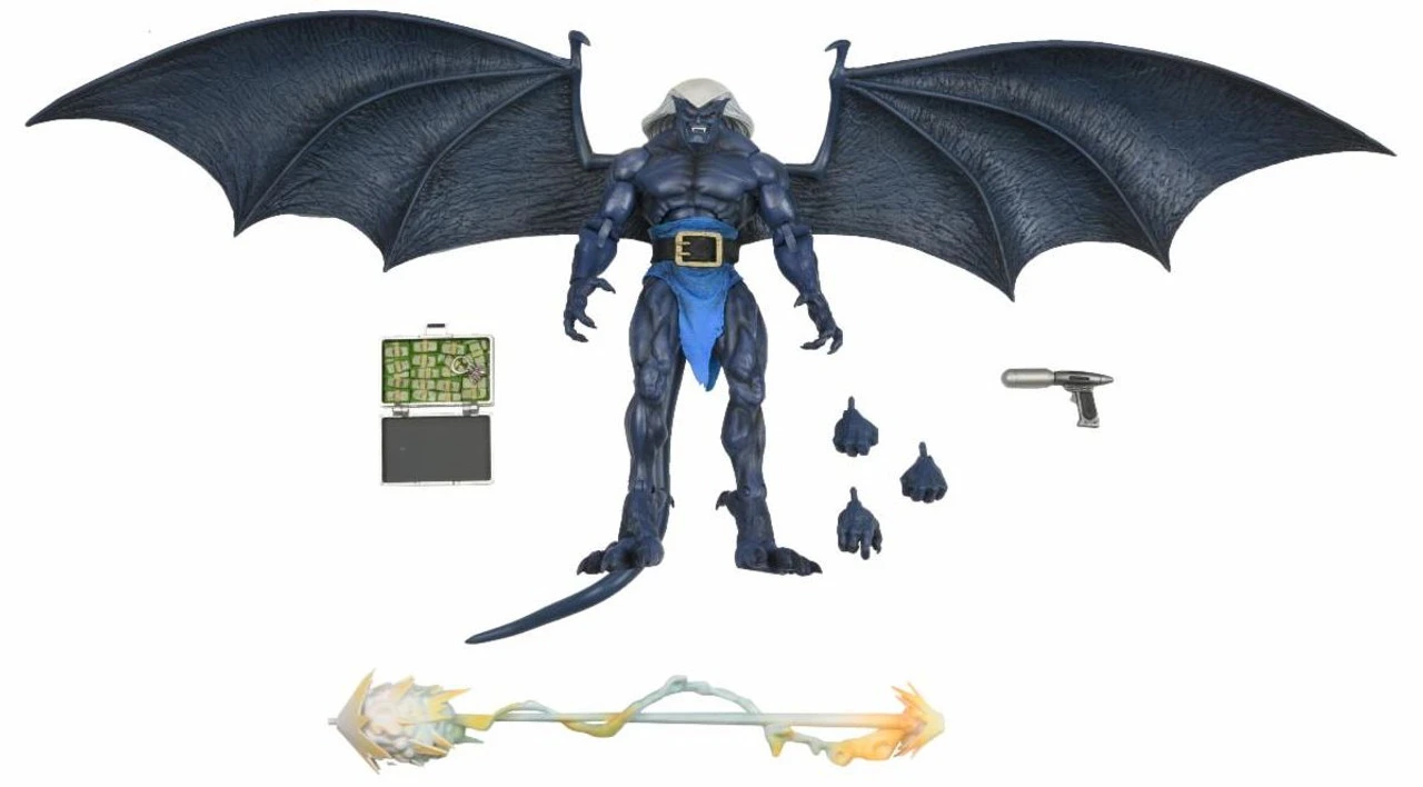 Thailog was created with genetic material stolen from clan leader Goliath — as a result he is just as strong and intelligent but utterly evil thanks to Xanatos’ subliminal indoctrination. The Thailog action figure measures 8 inches with a wingspan of 16 inches! The figure features full articulation, including on wings and tail, and comes with plenty of accessories: briefcase with removable money, flare gun, and interchangeable heads and hands.