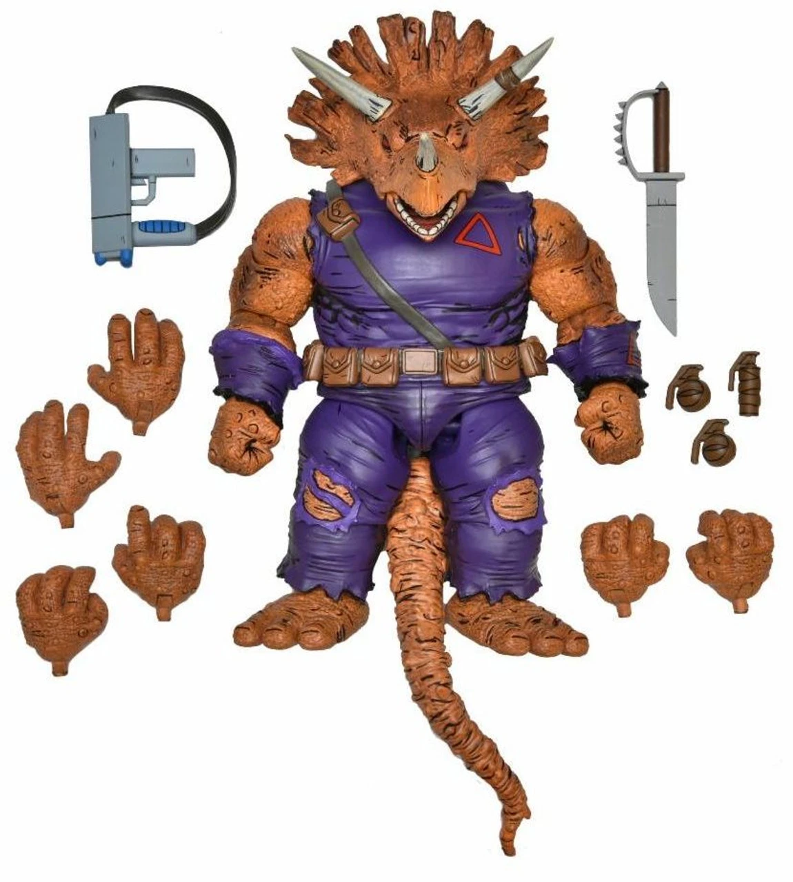 Itโs terror in the sewers for anyone unlucky enough to come across Zog, a Triceraton soldier who fled to the tunnels after escaping the TCRI research building. The deluxe figure is almost 8″ tall, and includes extra hands, blaster, grenades, and machete!